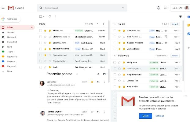 If you currently have multiple inboxes in an unsupported configuration, you will see a notification in Gmail informing you of this upcoming change. Once this change takes effect, the preview pane will turn off if you use multiple inboxes. If you want to continue using preview pane (i.e. reading pane), you’ll need to use an inbox type other than multiple inboxes. You can do this by going to Settings > Inbox > Inbox type.