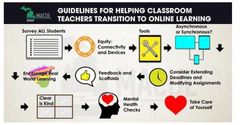 The Michigan Association for Computer Users in Learning (MACUL) has composed and shared useful guidelines around supportive considerations in a successful transition to online learning.  Please browse to https://macul.org/online-learning-guidelines/ to check them out.