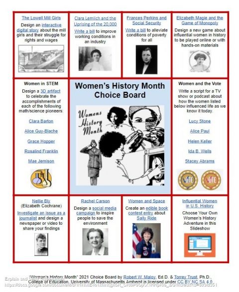 March is Women’s History Month. Here is a choice board that can be used by students to help students explore influential women and create something using their new knowledge. You can explore it yourself to find things that relate more specifically to your content. These are geared toward upper grade levels.